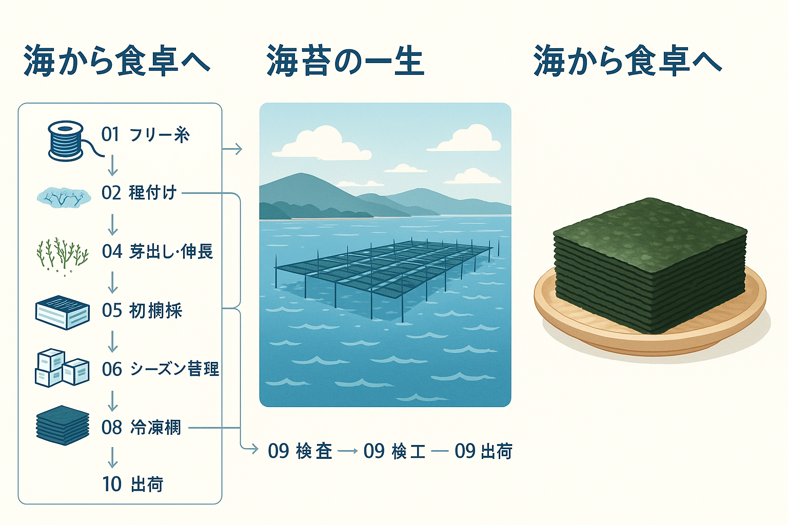 海苔養殖海苔づくりは「海に網を張って待つ」だけではありません。フリー糸(種糸)を受け取り、網へ種付けし、海上で育て、摘採して加工し、検査を経て出荷されるまで、たくさんの工程と判断があります。本記事では全体の流れをタイムラインで整理し、各フェーズで何を見て・何をするのかを俯瞰します。初めての方でも読み進めやすいよう、専門用語を最小限にし、写真で“現場の空気”が伝わる構成にしました。